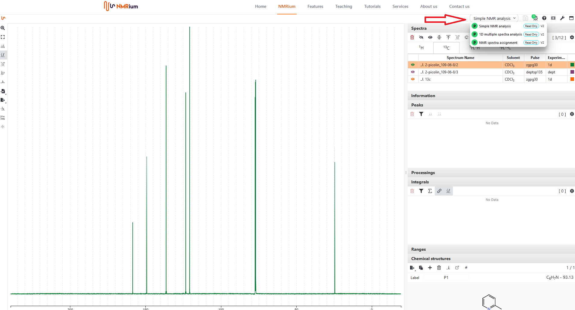 On the right side of the workspace, there is an expandable menu with several panels. Click onto the panel Spectra. The spectra are matched to the measured nuclei (e.g., ¹H, ¹³C, etc) which are displayed in the opened field. If you click onto a nucleus, you can find the matching spectra. To select an experiment, press the corresponding line. The spectrum appears in the workspace.